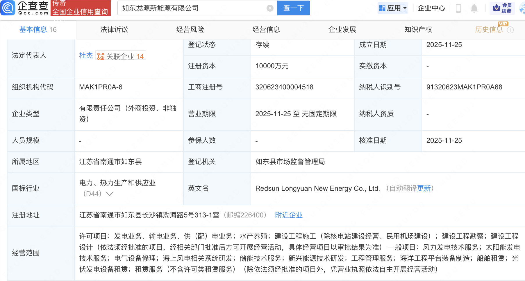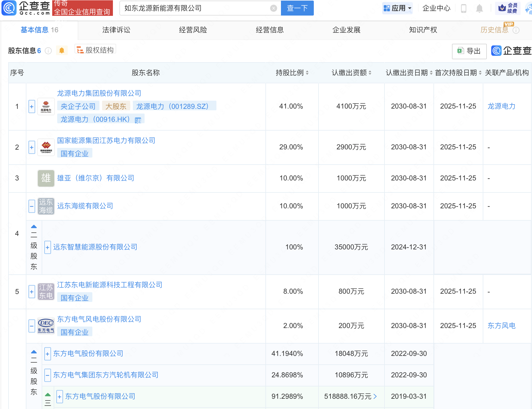 近日,如东龙源新能源有限公司成立,注册资本1亿元,经营范围包含:风力发电技术服务;太阳能发电技术服务;电气设备修理;海上风电相关系统研发;储能技术服务等。企查查股权穿透显示,该公司由龙源电力(001289)、国家能源集团江苏电力有限公司、远东股份(600869)全资子公司远东海缆有限公司、东方电气(600875)旗下东方电气风电股份有限公司等共同持股。